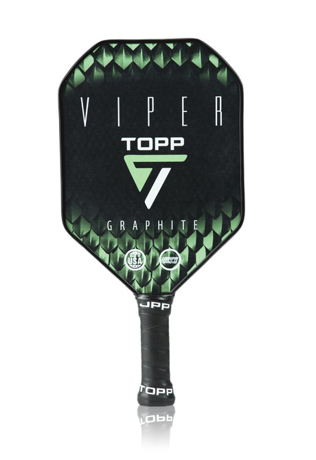 The viper graphite paddle complements players of varying levels of play, thanks to its combination of length and shape. By maximizing width and length, and adjusting the corners to fit, the viper has maximized the sweet spot of a paddle. By being able to reduce the corners, it gains a unique V shape, which reduces the overall weight of the paddle as well as allows players to gain more space for that two-handed backhand shot. The Viper graphite is able to deliver exceptional control off the surface, while still allowing players to develop the power you need to excel in your play. The viper graphite is everything a player expects out of a TOPP paddle, and more.
