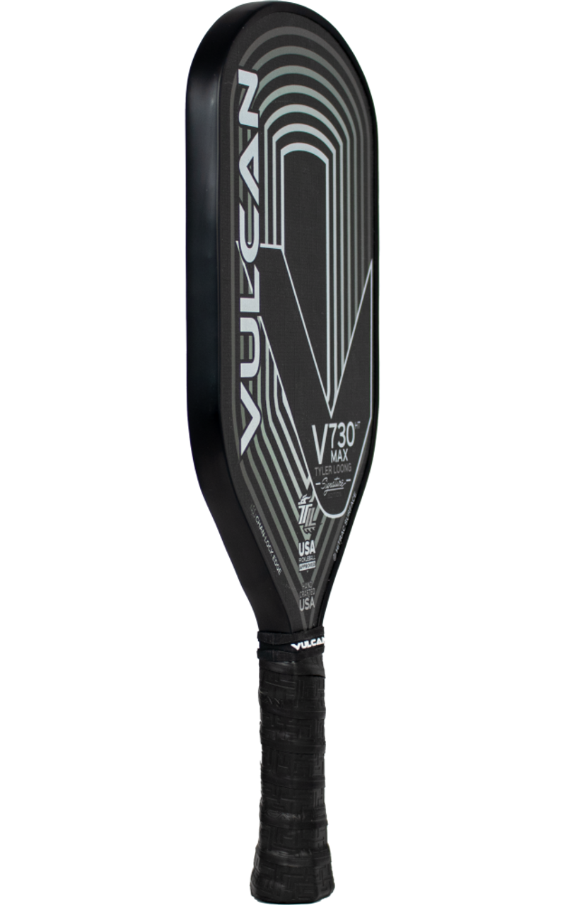 The Vulcan V740HT MAX Pickleball Paddle is Team Vulcan Pro Jay Devilliers' signature model. Features his favorite modern shape with extended handle, perfect for two-handed backhands, extra reach, and more leverage on drives, serves and overheads. Produces maximum power while delivering exceptional all-around feel and control. Features H¡TRAC Surface Grit for spin and CHAN-LOCK Edge System for an enlarged sweet spot. Designed for singles and doubles. Engineered with remarkable balance so it feels and plays much lighter than its actual mass.